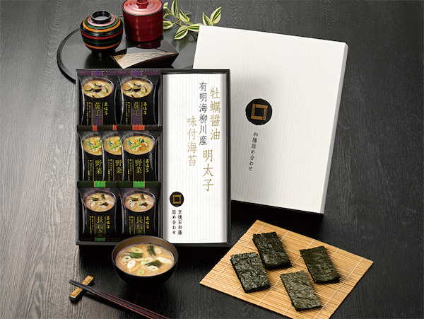 内容:京懐石フリーズドライ即席味噌汁 (茄子×2・野菜 ×3・長ねぎ ×2)、有明海柳川産味付海苔8切6枚、(牡蠣醤油×1・明太子×1・味付のり×1)