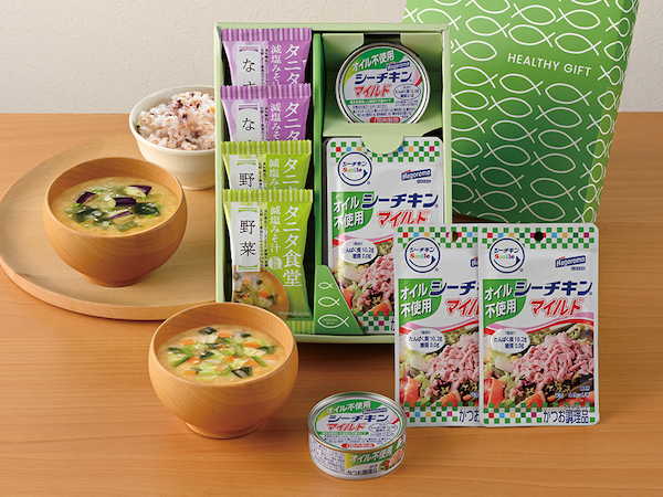 内容:はごろもシーチキンオイル不使用 70g マイルド缶×1、マイルド 50g パウチ×2、タニタ食堂監修減塩みそ汁 (なす×2 野菜×2)